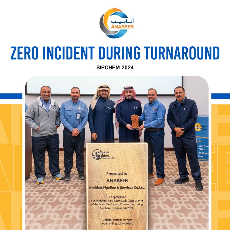 بروح الإنجاز والتميز، تفخر ANABEEB بتكريمها من قبل SIPCHEM لإتمام الصيانة الدورية لعام 2024 بنجاح، دون تسجيل أي حالة إصابة.